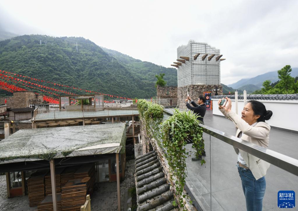5月8日,在四川省汶川縣映秀鎮,鐘朝輝和曲海望(右)用手機拍攝映秀鎮的風光。