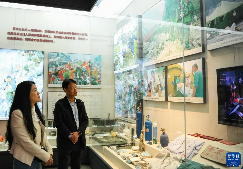 5月8日,鐘朝輝(右)和曲海望在“5·12”汶川特大地震映秀震中紀念館參觀。