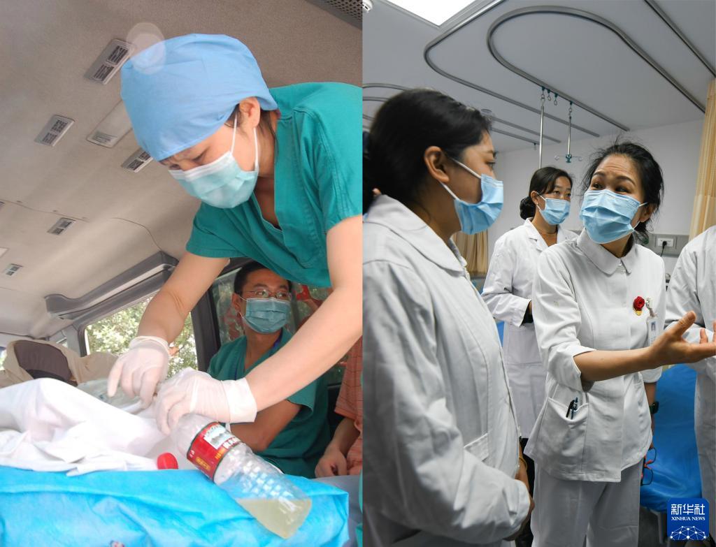 拼版照片:左圖是北京大學第一醫院主管護師曲海望(前)在成都雙流機場轉運傷員途中為傷員護理(2008年5月30日攝,新華社發);右圖是曲海望(右)和汶川縣中醫醫院急診科的護士交流(2023年5月9日新華社記者王曦攝)。