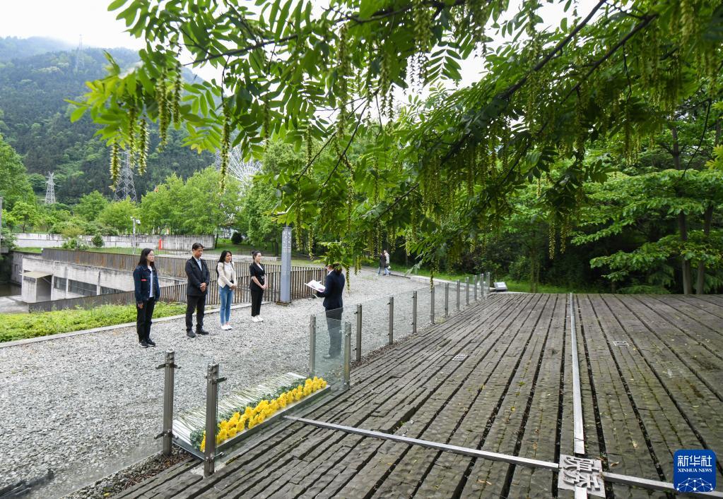 5月8日,鐘朝輝(左二)和曲海望(左三)在“5·12”汶川特大地震映秀震中紀念館外聆聽邱光華機組英雄事跡微黨課。