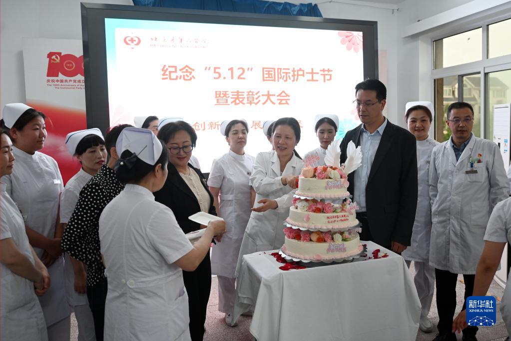 5月12日,參加護士節活動的嘉賓和醫護人員共同切蛋糕。