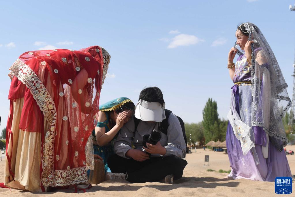 5月11日,游客在鳴沙山月牙泉景區體驗旅拍項目。