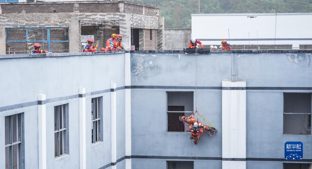 安順消防救援支隊隊員在進行高空救援演練(5月11日攝)。