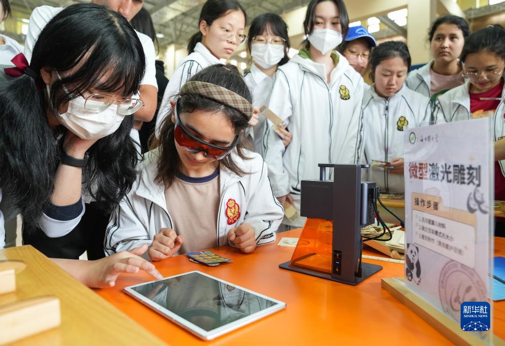 當日,上海市位育中學開展校園科技活動,為學生們帶來一場“科技大集”。學生們通過體驗微型激光雕刻、觀看機器人演示等科教活動感受科技魅力。