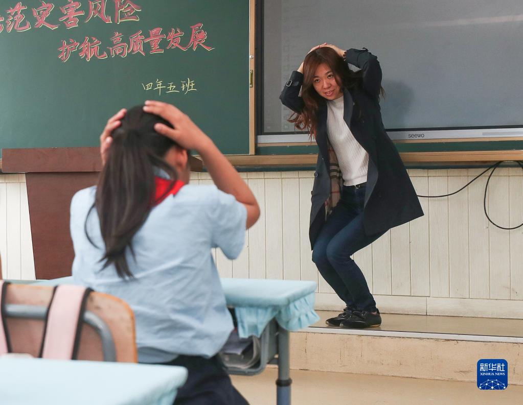 5月12日,沈陽市北塔小學的老師為學生演示應急避險動作。