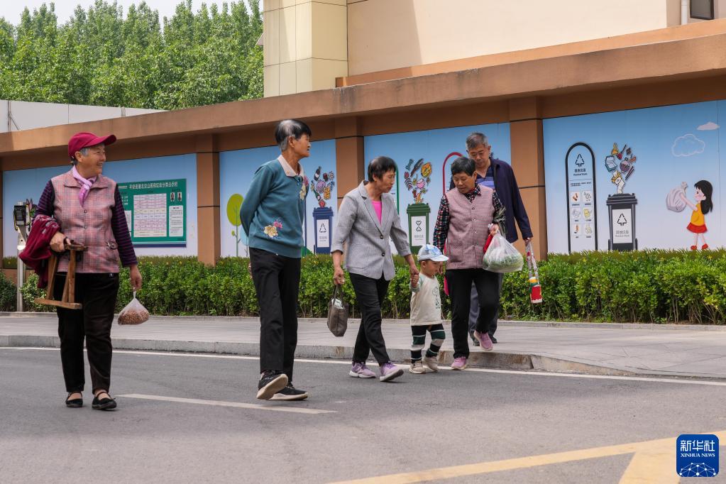 5月12日,北汝村居民在環境整潔的安置小區內散步。