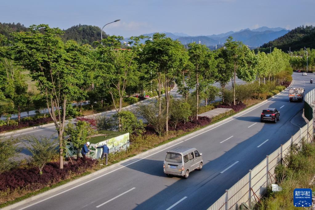 5月11日,中建十堰管廊公司運維人員在巡檢紫霄大道管廊通風口(無人機照片)。