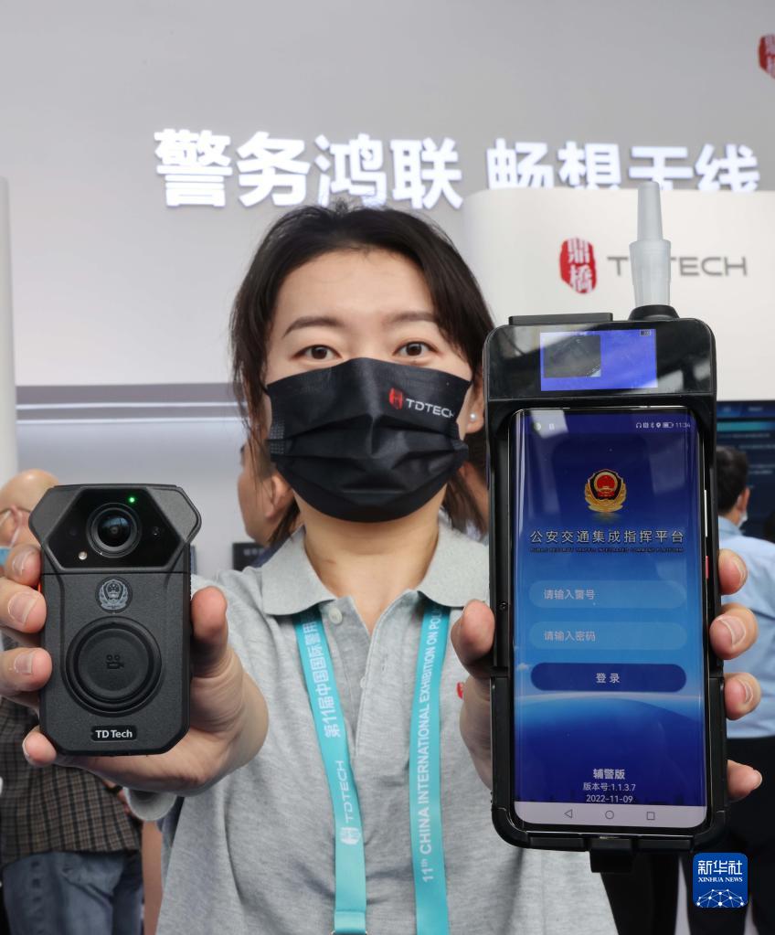 5月12日,工作人員在展示交警多功能移動警務終端(右)和5G執法記錄儀。