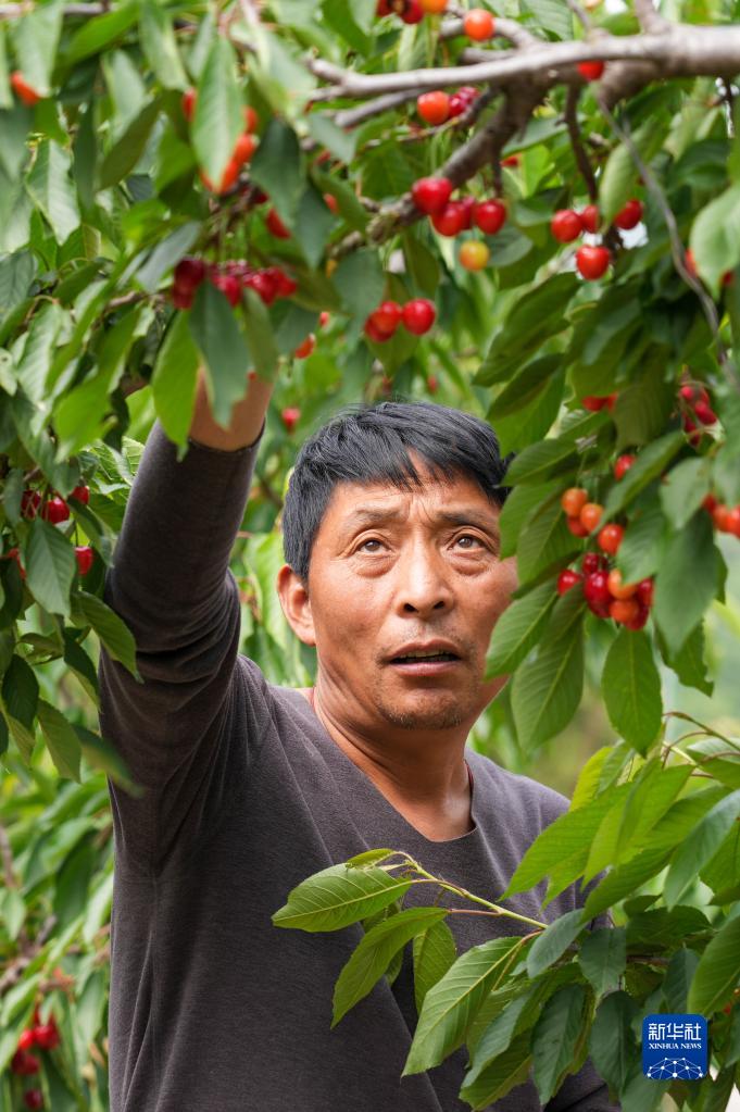 5月12日,五峰山街道紙坊村黨支部書記邢念勇在自家黨員種植示范園內采摘櫻桃。