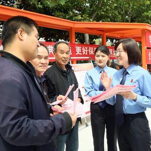 5月12日,在河南省洛陽市汝陽縣政府廣場,洛陽市司法局和汝陽縣司法局普法宣傳志愿者向群眾發放民法典宣傳資料。