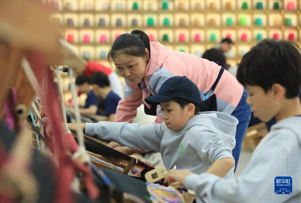 5月12日,來自上海包玉剛實驗學校的學生在張家界市武陵源區乖幺妹土家族織錦基地學習體驗土家族織錦非遺技藝。