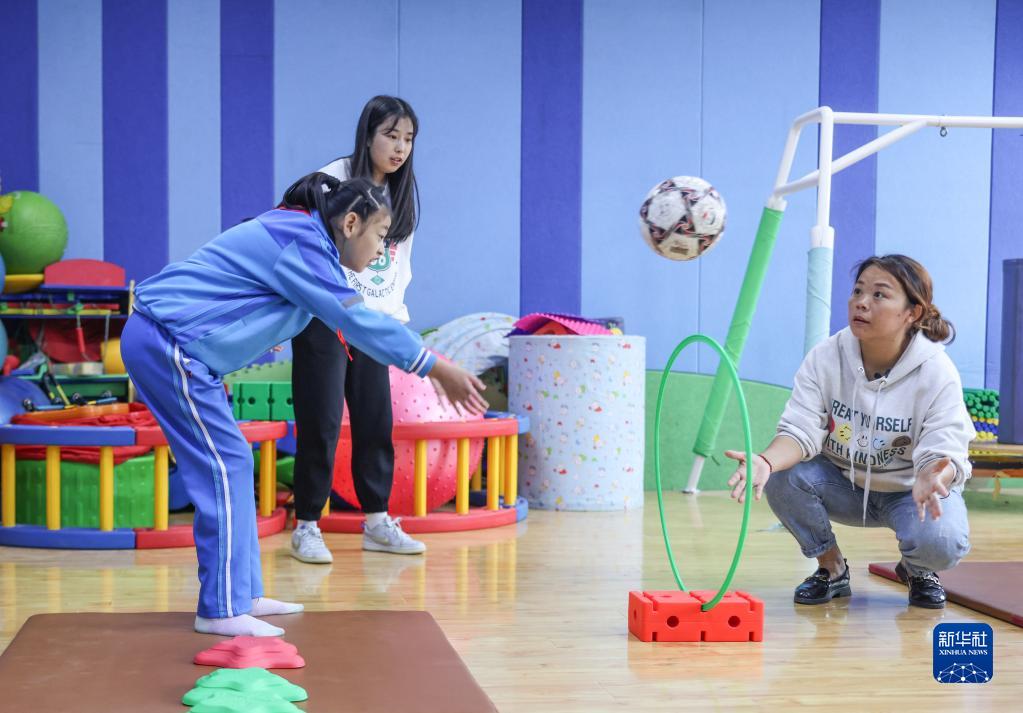 在陜西省渭南市特殊教育學校的感覺統合室,王鴿幫助女兒趙懿菲進行訓練(5月9日攝)。