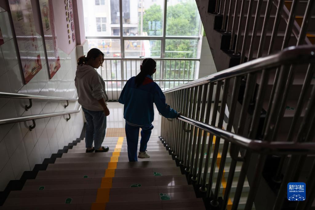 在陜西省渭南市特殊教育學校,王鴿鼓勵女兒趙懿菲獨自下樓梯(5月9日攝)。