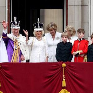 5月6日,在英國倫敦,英國國王查爾斯三世和王后卡米拉加冕后在白金漢宮陽臺向民眾揮手致意。