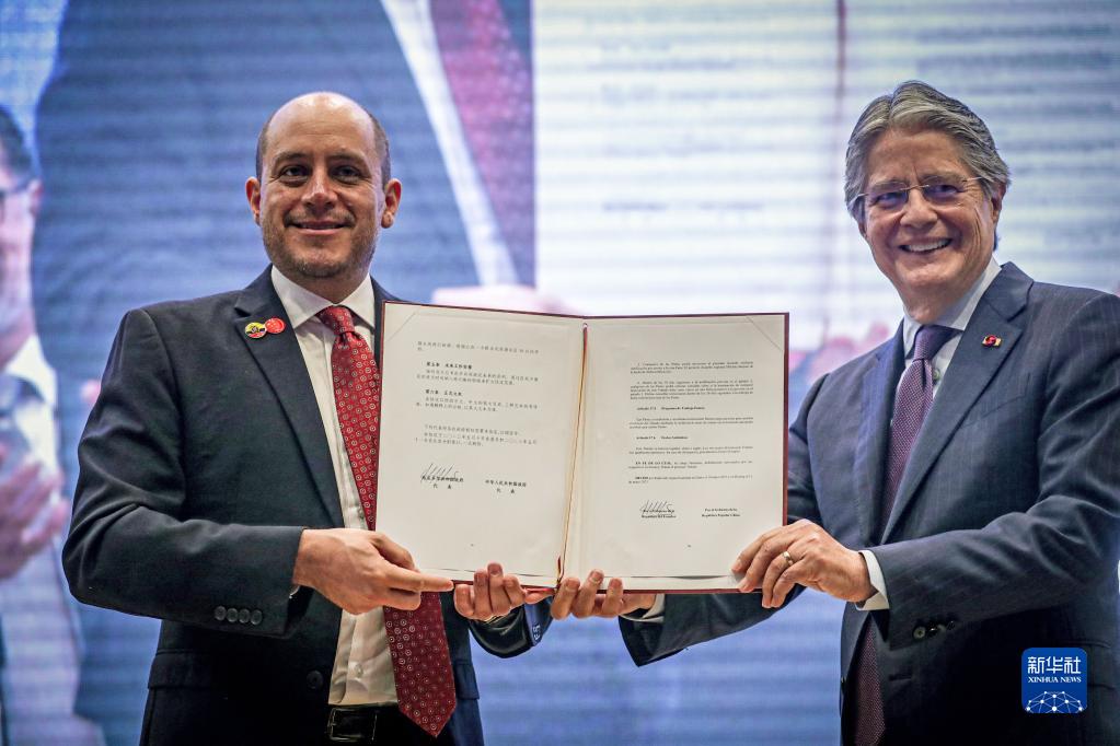 5月10日,厄瓜多爾總統拉索(右)與厄瓜多爾生產、外貿、投資和漁業部部長普拉多在厄瓜多爾基多展示中厄自貿協定文件。