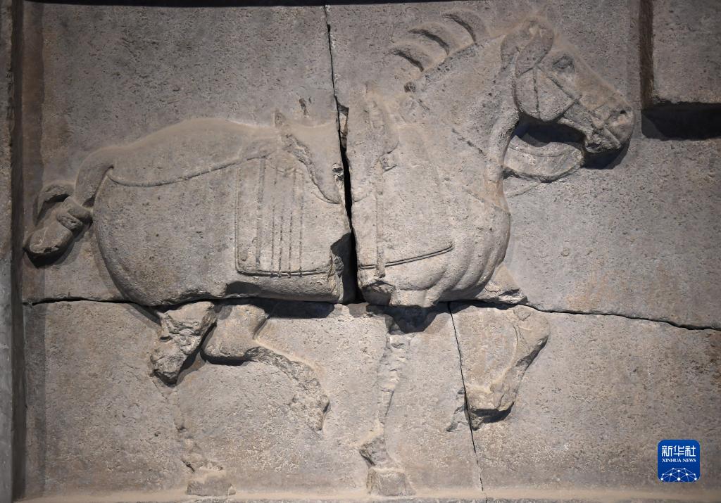 這是在西安碑林博物館內拍攝的昭陵六駿石雕特勤驃(5月9日攝)。唐昭陵六駿石刻是為紀念六匹隨唐太宗李世民征戰疆場的戰馬而刻制的,其中特勤驃等馬匹帶有明顯的西域良馬特征。
