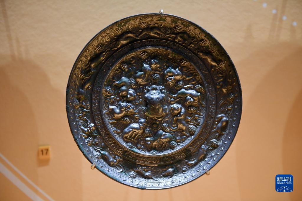 這是在西安博物院展出的唐代瑞獸葡萄紋銅鏡(5月8日攝)。葡萄、苜蓿等農作物通過絲綢之路傳入中國。