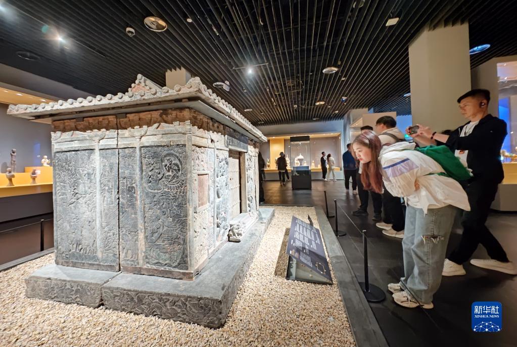 5月8日,游客在西安博物院參觀史君墓石槨。墓主史君是北周涼州薩保,粟特人。石槨整體為中國傳統歇山頂殿堂式建筑,四壁浮雕內容和風格則帶有鮮明的西域特色。
