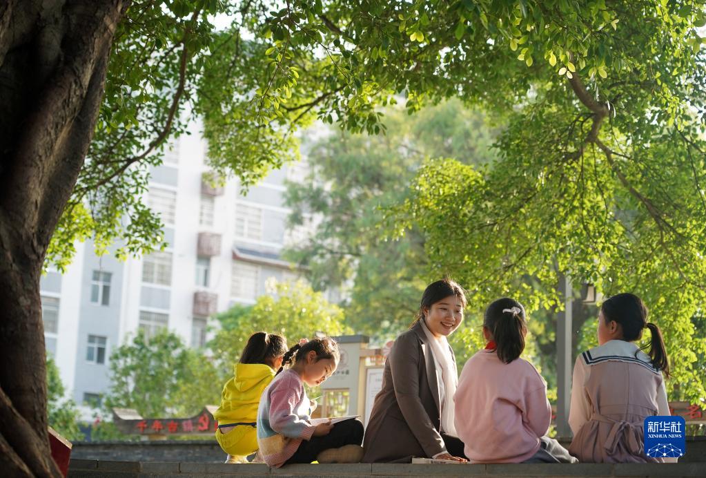 在江西省贛州市南康區盧屋村,“童伴媽媽”盧婕(右三)與孩子們談心(4月26日攝)。