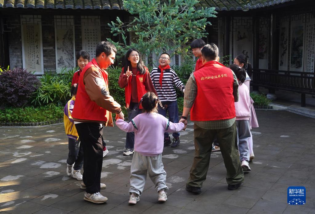 在江西省贛州市南康區盧屋村,志愿者與孩子們一起互動游戲(4月26日攝)。