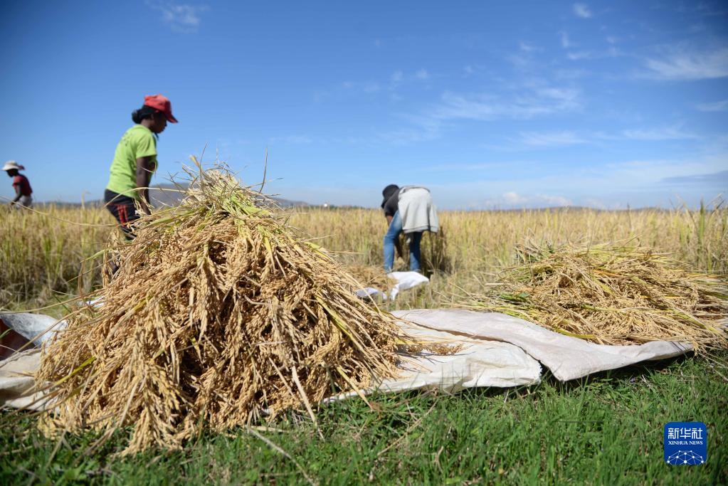 5月12日,在馬達加斯加首都塔那那利佛附近馬希奇鎮的中國國家雜交水稻工程技術研究中心非洲分中心,當地農民在雜交水稻高產示范田內收割水稻。