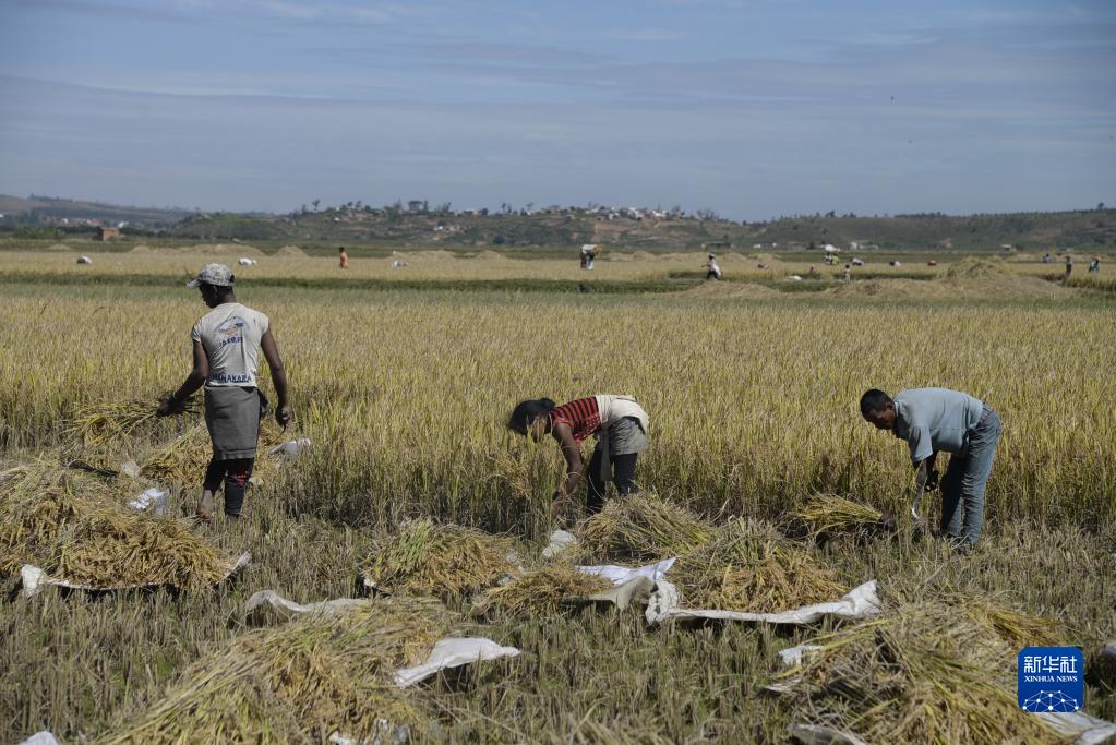 5月12日,在馬達加斯加首都塔那那利佛附近馬希奇鎮的中國國家雜交水稻工程技術研究中心非洲分中心,當地農民在雜交水稻高產示范田內收割水稻。