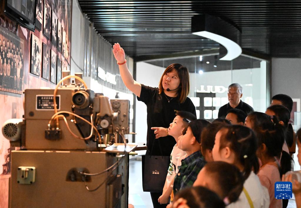 在天津海鷗表博物館,講解員在給小學生講述天津海鷗表業集團發展歷程(5月12日攝)。