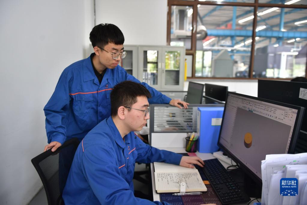 5月12日,在沈陽睿昇精密制造有限公司,一名已和企業簽約的沈陽工學院機械工程與自動化學院畢業生(下)在企業車間辦公室設計零部件。