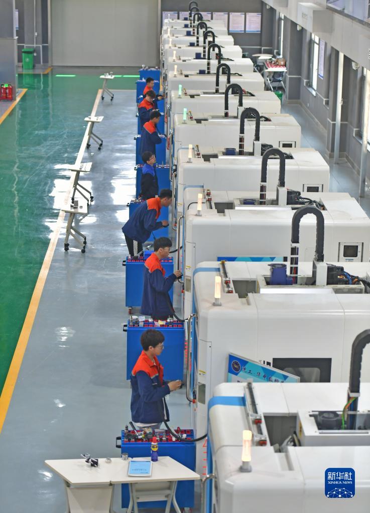 5月12日,沈陽工學院機械工程與自動化學院學生在學校實訓車間操作五軸加工中心。