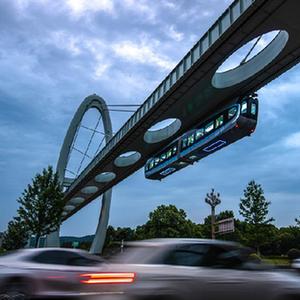 5月9日拍攝的武漢“光谷光子號”空軌列車??哲壛熊囓圀w懸掛于軌道梁下方凌空“飛行”,具有不占用地面路權、環境適應性強等優點,兼具通勤和觀光功能。