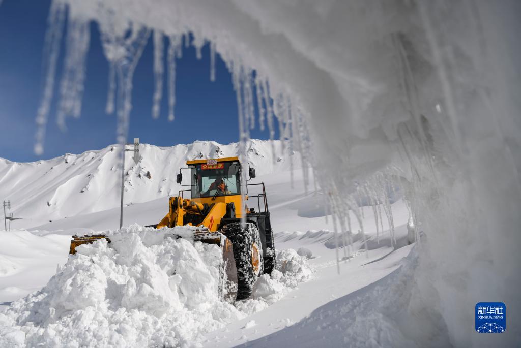 烏蘭薩德克養護站工人烏斯曼·巴克駕駛裝載機在獨庫公路的雪崩多發路段上清雪(5月9日攝)。