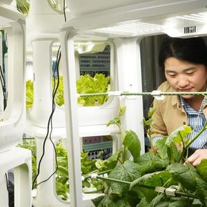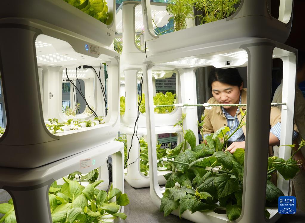 5月13日,上海農林職業技術學院的教師展示智能種植箱里的綠植。