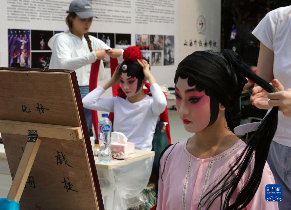 5月13日,上海市戲曲學校的學生在為展示活動做準備。