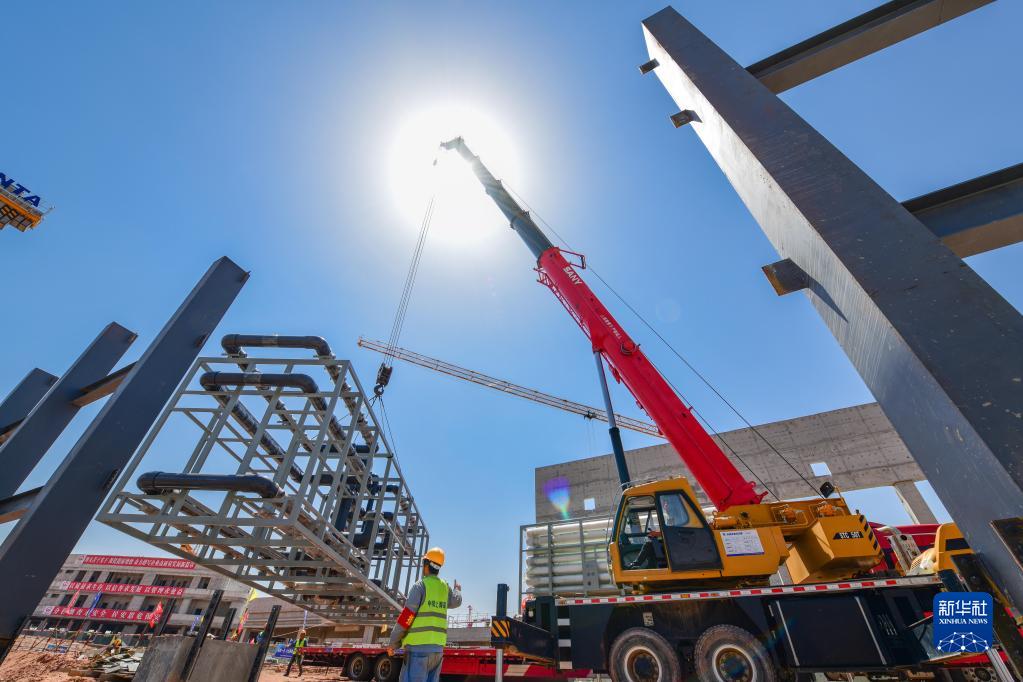 5月13日,工人在零碳產業園工業污水處理廠及水資源再生利用項目施工現場安裝設備。