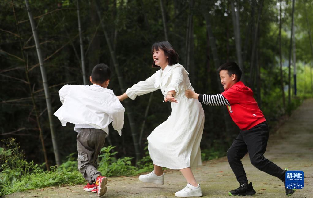 5月13日,在貴州省黔東南苗族侗族自治州岑鞏縣思旸鎮龍江村,一位母親與兩個兒子做游戲。