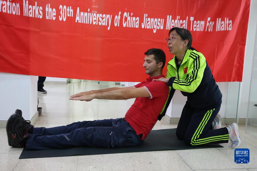 5月12日,在馬耳他馬爾薩什洛克,中國第18期援馬耳他醫療隊隊員邢雪梅在一名員工的幫助下演示頸腰痛康復治療的訓練動作。