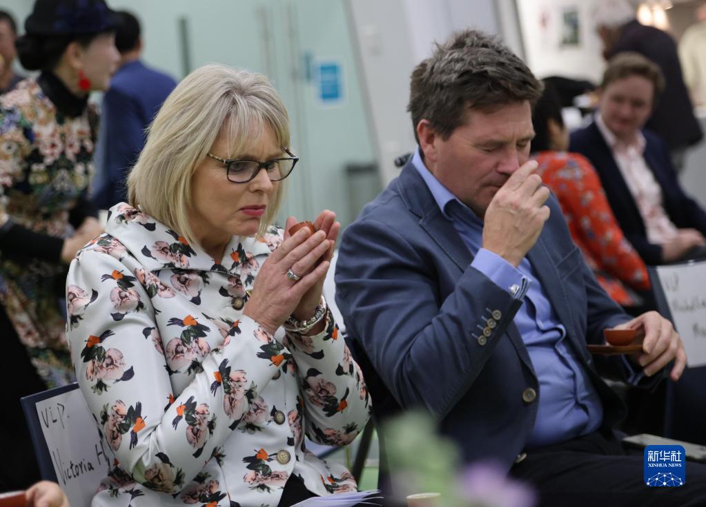 5月12日,在新西蘭克賴斯特徹奇舉行的“茶和天下·雅集”系列活動走進社區活動上,克賴斯特徹奇市議員維多利亞(左)品嘗中國茶。新華社發(孟韜 攝)