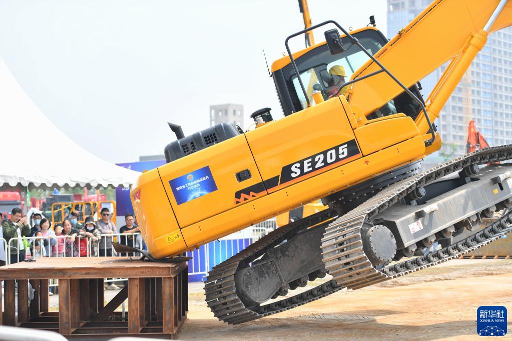 在湖南長沙舉辦的第三屆長沙國際工程機械展覽會上,機手們駕駛挖掘機和裝載機進行整機漂移、“空中漫步”等,并擺出各種造型、秀“舞技”。
