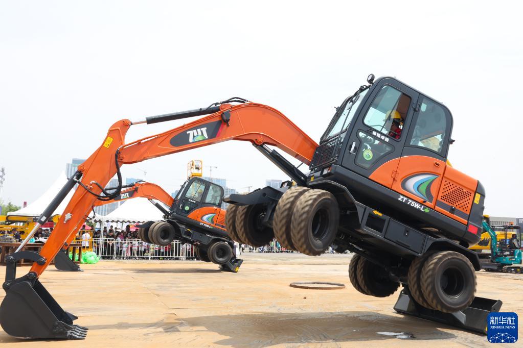 5月13日,在長沙國際工程機械展覽會上,機手駕駛輪式挖掘機表演。