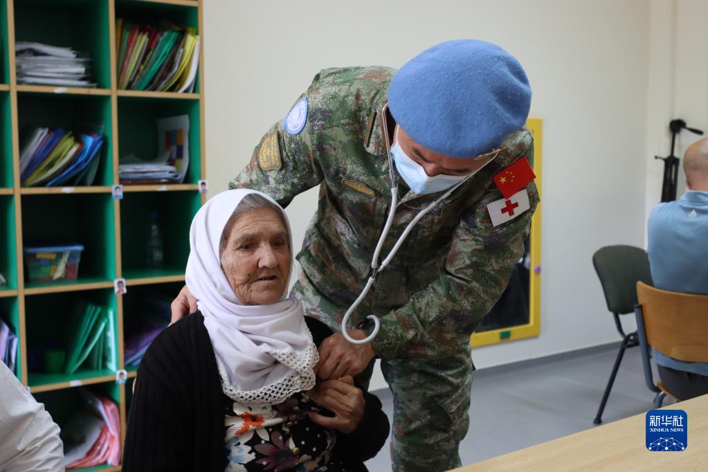 5月12日,在黎巴嫩阿爾庫卜關愛與發展中心,參加義診活動的中國第21批赴黎巴嫩維和醫療分隊內科醫師鄭喜源為病人查體。