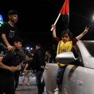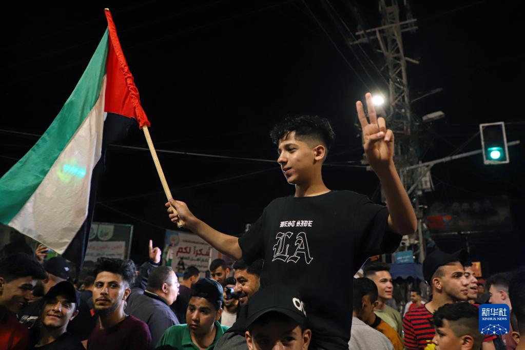 5月13日,巴勒斯坦人在加沙城街頭慶祝?;饏f議達成。