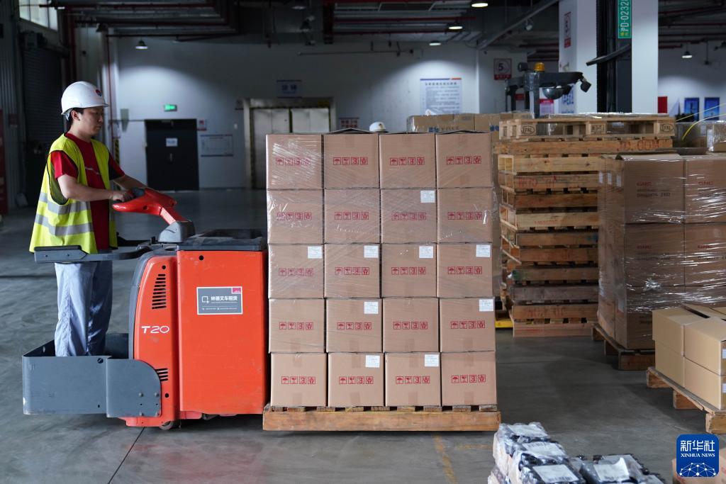 5月13日,在虹橋商務區保稅物流中心(B型),工作人員在運輸跨境電商貨物。