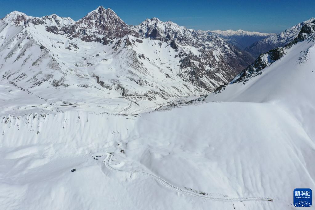 新疆獨庫公路穿越雪山延綿的高海拔山區(5月10日攝,無人機照片)。