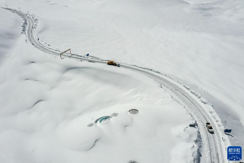 新疆奎屯公路管理局獨山子分局烏蘭薩德克養護站的工人駕駛車輛在獨庫公路上進行清雪、養護作業(5月10日攝,無人機照片)。