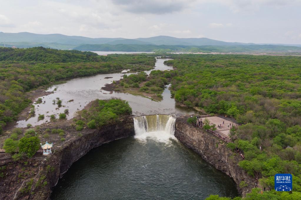 這是5月14日在黑龍江省牡丹江市拍攝的鏡泊湖世界地質公園吊水樓瀑布(無人機照片)。