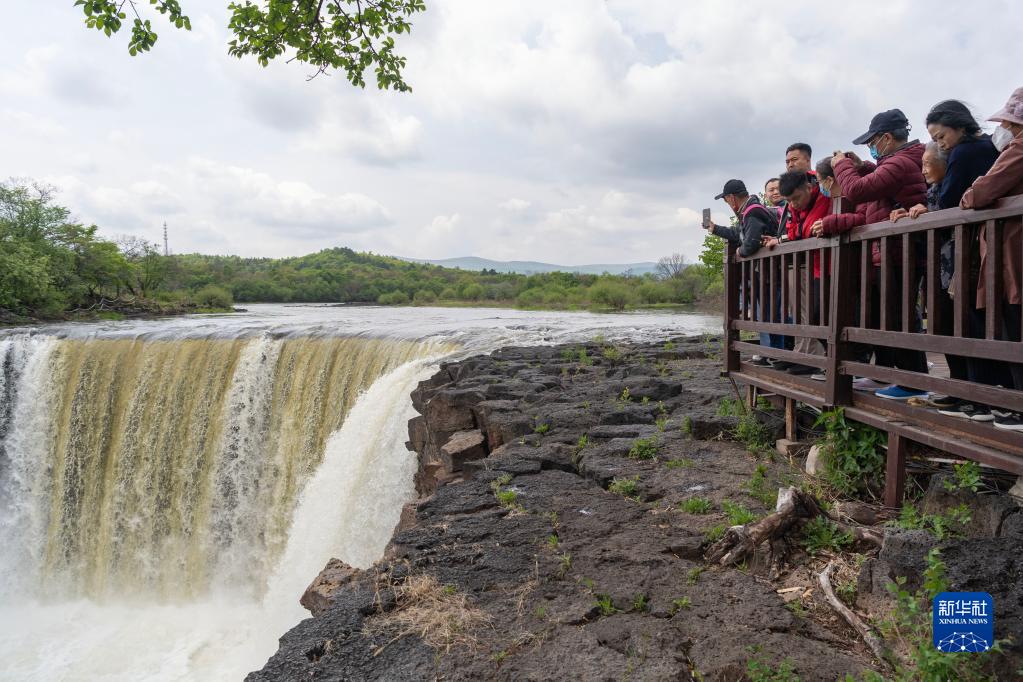 5月14日,游客在黑龍江省牡丹江市的鏡泊湖世界地質公園吊水樓瀑布旁觀賞游玩。