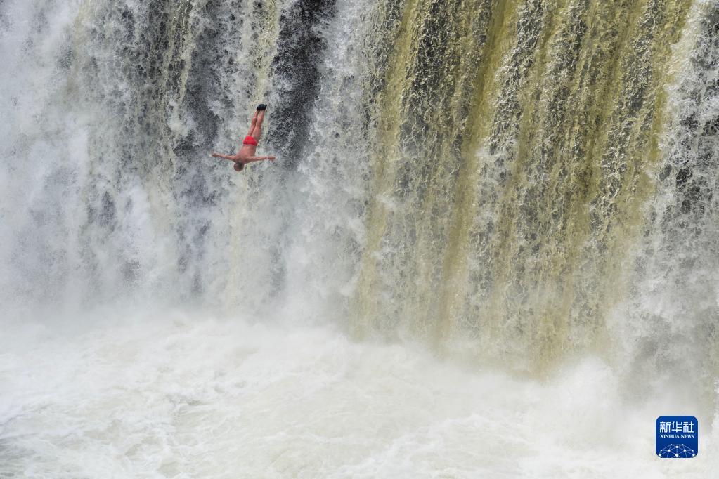 5月14日,在黑龍江省牡丹江市的鏡泊湖世界地質公園,瀑布跳水表演者狄煥然從吊水樓瀑布上縱身躍下。