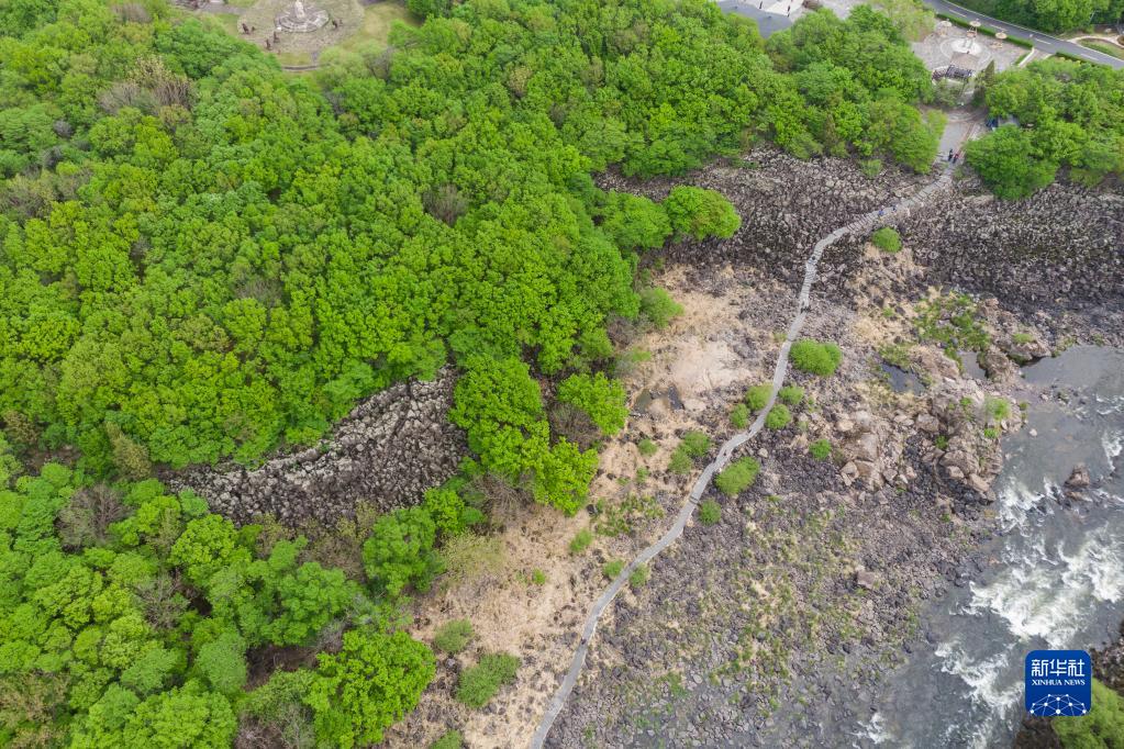 這是5月14日在黑龍江省牡丹江市拍攝的鏡泊湖世界地質公園風光(無人機照片)。