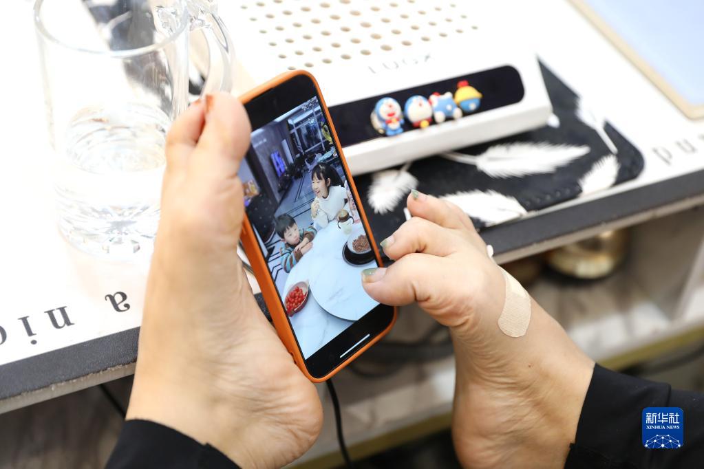 5月11日,韓丹翻看著手機里兩個孩子的視頻。