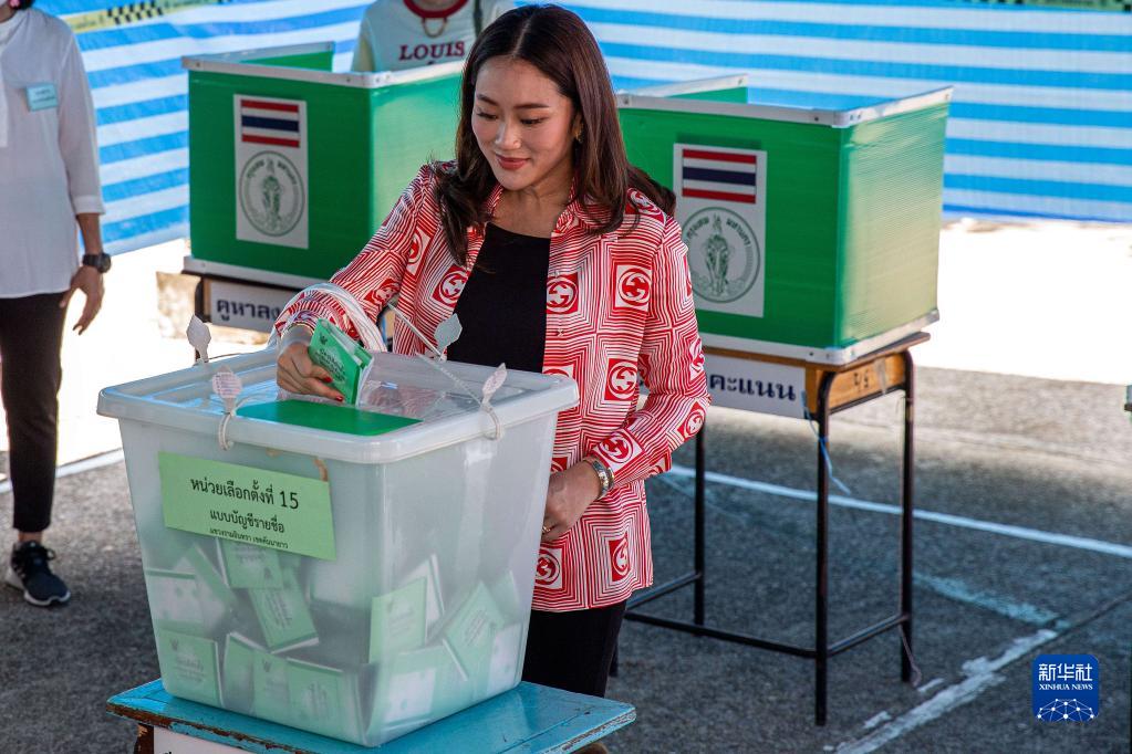 5月14日,泰國為泰黨總理候選人貝東丹在曼谷一處投票站投票。